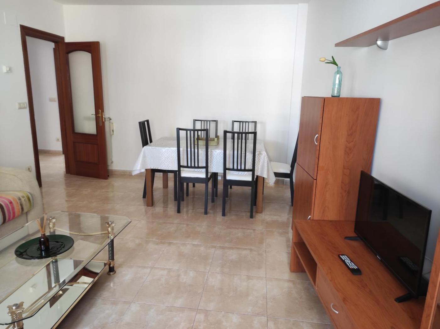 The spacious apartment includes 2 bedrooms and a living room with a flat-screen TV.