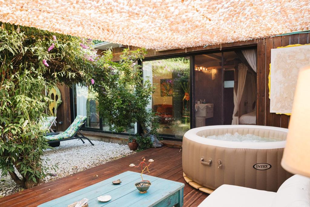 One-Bedroom Apartment. This apartments standout features are the hot tub and spa bath. Boasting a private entrance, this apartment also includes 1 bedroom, a seating area and 1 bathroom with a shower and a hairdryer. Guests will find a stovetop, a refrigerator, kitchenware and a microwave in the well-equipped kitchen. The apartment also features a barbecue. Featuring a terrace with garden views, this apartment also offers a tea and coffee maker and a flat-screen TV. The unit has 1 bed.