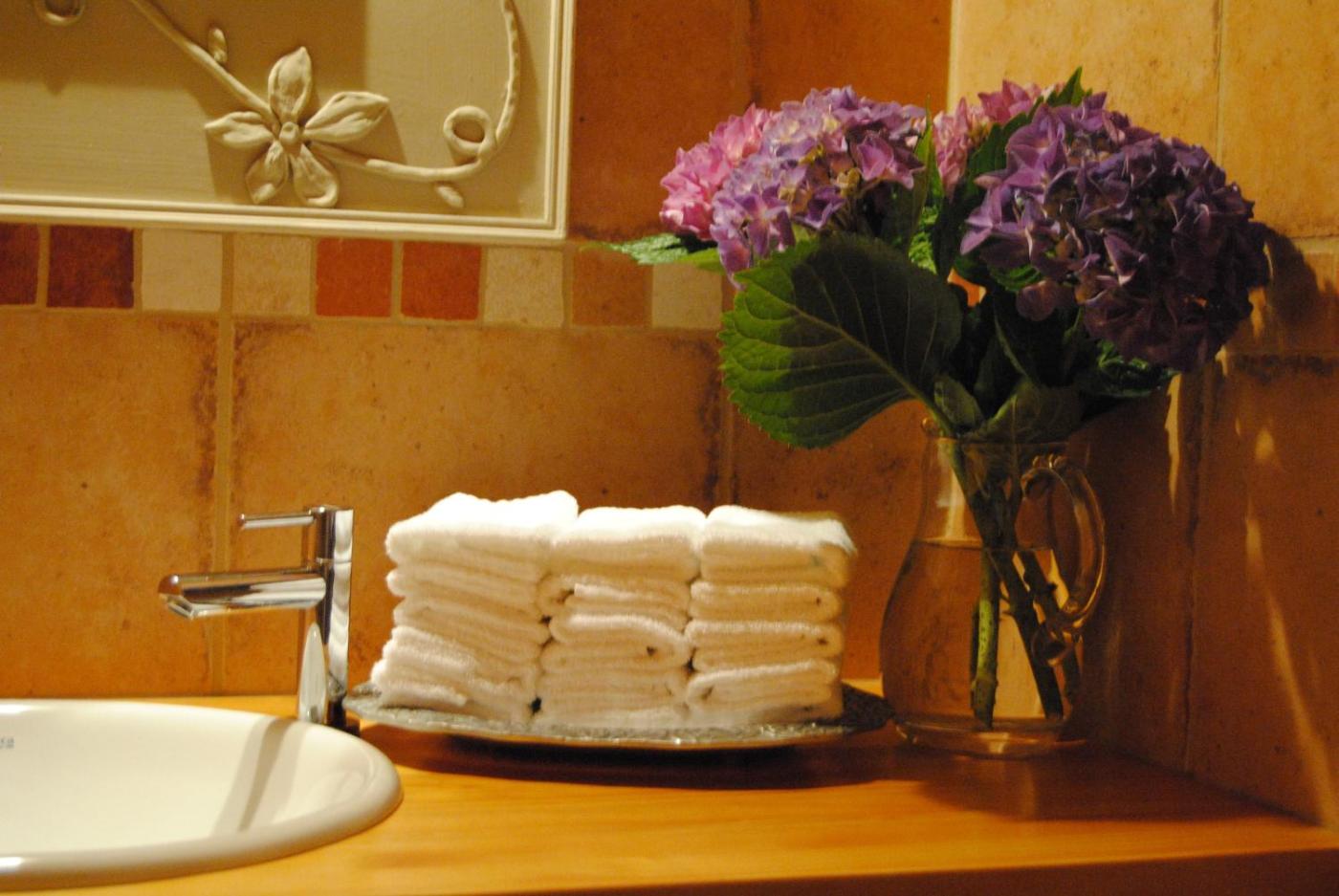 Double Room. This spacious room has modern décor. There is heating, a flat-screen TV and a private bathroom. The bed comes with latex mattress and pillows. It offers garden views. Room sizes range from 15 m2 to 30 m2. Notrooms have stone walls. ;